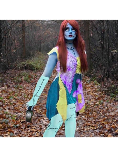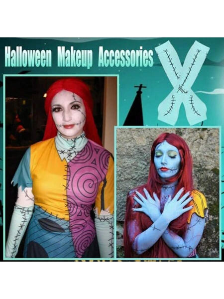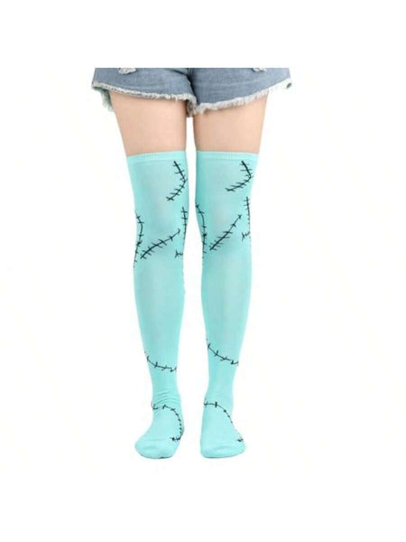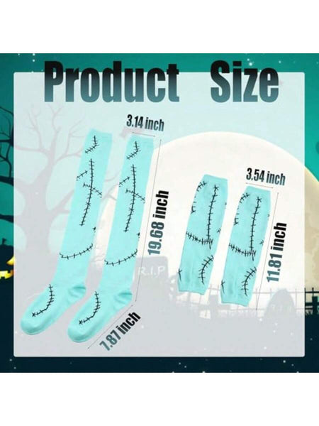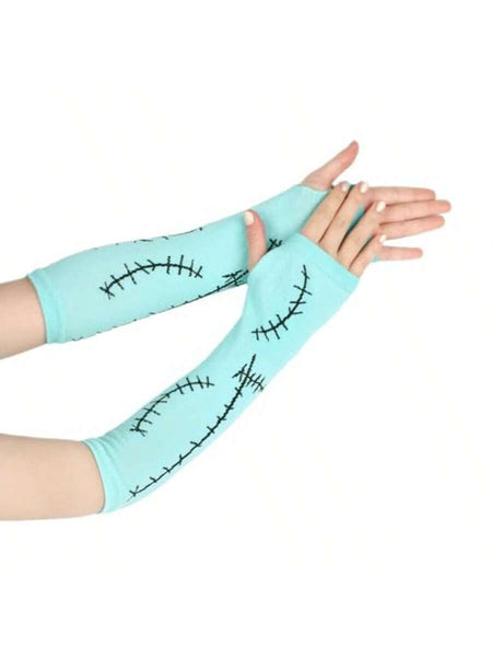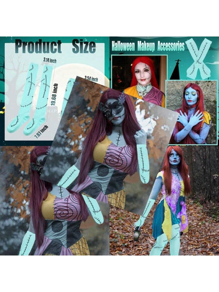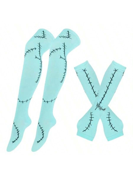 Women Stitched Scar Arm Sleeves Light Blue Thigh Highs Stocking For Nightmare Before Christmas Halloween Cosplay Accessories